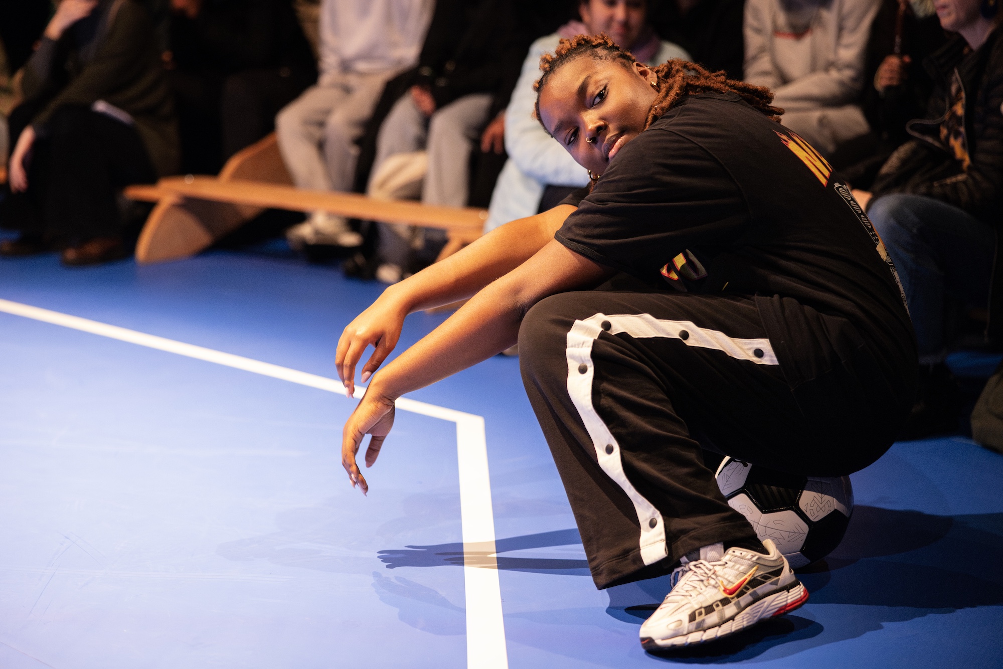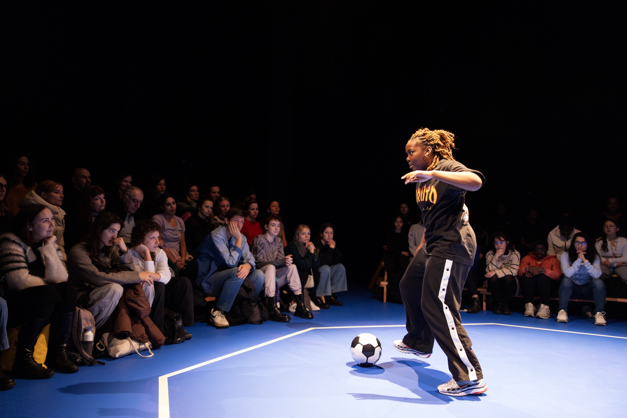 Notre société contemporaine ne comporte plus de rites pour le passage à l’âge adulte, en tous cas aucun qui ne soit pas religieux. Cette période est un grand continuum sans forme, sans règles… Il s’agit donc de créer ici un rite de passage : partir du football, du dribble pour abandonner l’enfance, accueillir la transformation qui s’opère, changer de peau -celle que l’on a, qui nous colle comme une étiquette et celle que l’on voudrait changer- en un mot : muer. Partir un ballon de foot au pied pour aller jusqu’à la transe, à la recherche du seuil, du passage de son enfance déjà derrière pour se diriger vers le monde adulte encore inaccessible.