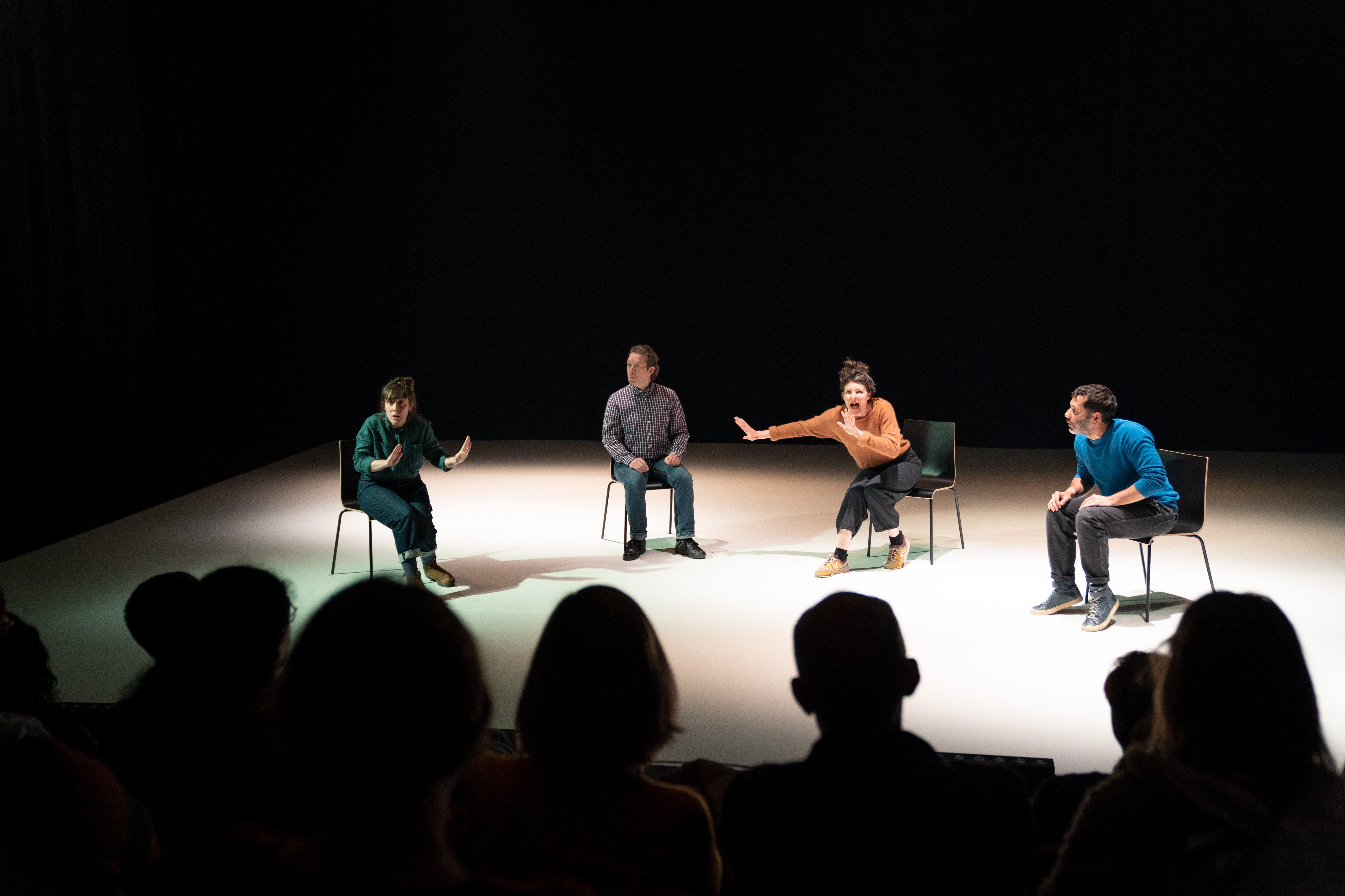 Sur le plateau, paralysés sur leur chaise comme les aveugles, les quatre acteur·ices cherchent l’expérience « ultime » pour représenter cette pièce.